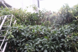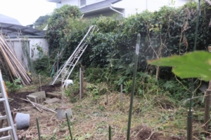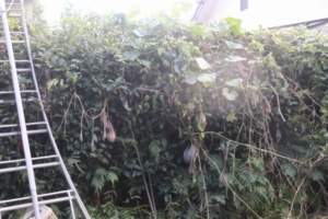 南側の金木犀の上に蔓植物や瓢箪南瓜が這っている。金木犀の枝も伸びている、この高さでは、陽の辺りが悪くなるので、隣の家が見えない程度の高さに剪定する必要がある。何とか、始めたところだ。時間がかかりそうである。畑11月である。