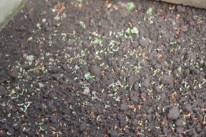 3回ほど蒔いても芽が出なかったリーフレタス(↓)がようやく芽を出した。2袋分の芽が出ているので、植え替えるのに時間がかかりそうである。芽が出て、ある程度大きくなった頃に植え替えが出来れば、比較的たくさん生る野菜である。ただ、同じ場所に植えていると、根が腐ってどろどろになる。今年は地面に希釈した酢をこまめに撒けるといいんだが。