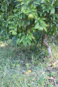 高台の公園の長い階段を上るか、上の公園に登る車道を歩いて上ることもあるが、大抵は高台の側面の山肌(↑)を登る。いつの頃からか、西の斜面の大きな杉を切って下の方に柑橘類を植えている。毎年実をつけるが、今は黄色くなる前に落ちる実(↓)もある。毎年、落ちた日向夏の実をもらって帰っている。野菜にかけるとほんのり甘くて爽やかで食べやすい。