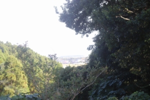 のぼると、高台の公園(↑)である。人がいない時もあるが、土日でない時も何人かいる時もある。西側はきれいに晴れていれば、尾鈴の山々が見える。東側には樹々の間から、青島(↓)が見える。考えれば、山の緑に澄んだ日向灘、住むにはいい所だ。