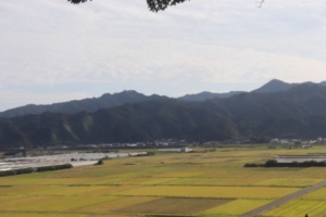展望所があって、南側は加江田の山々の東の端である。総合運動公園やサンマリーン球場や青島も見える。山の裾には田んぼが広がる。もう少しすれば、超早生米に向けて、田起こしが始まる。白鷺や烏が、耕運機の後をついて歩く。この時期の年中行事である。